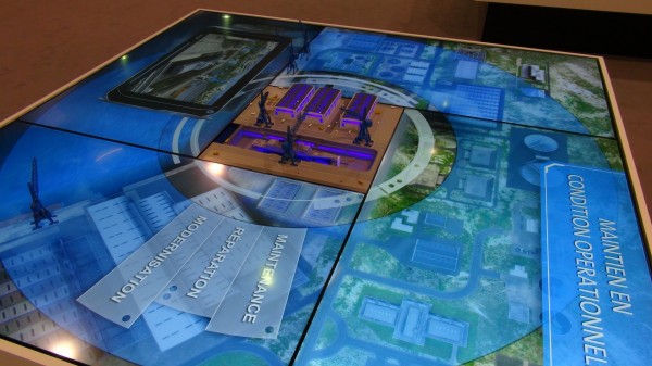 Ce podium interactif permet à DCNS d’effectuer une présentation en 20 scénarios de toute l’offre et le savoir-faire du groupe en terme de services, de formation et d’entretien de bases maritimes.