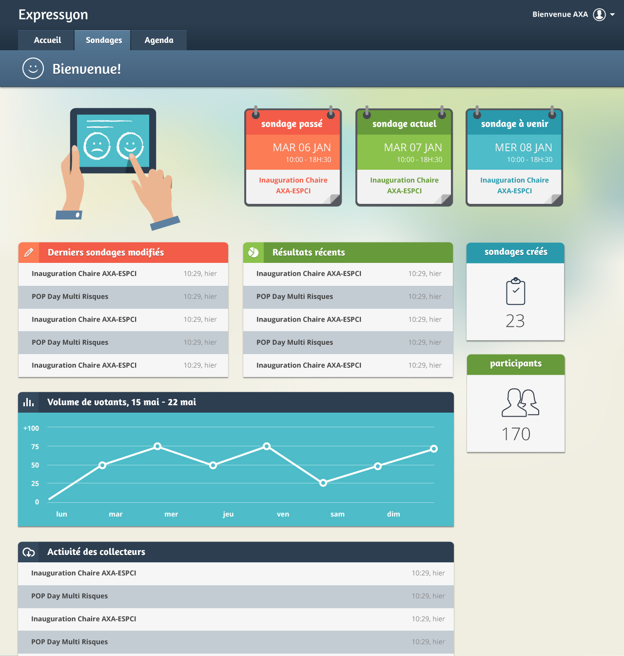 EXPRESSYON est une solution idéale pour sonder la satisfaction client, lancer des enquêtes de terrain ou vérifier la portée de vos évènements. Elle vous permet d’organiser des questionnaires et des sondages complets pour tout type de besoin, et vos visiteurs y répondent de façon ludique, interactive, et agréable, en quelques secondes seulement.