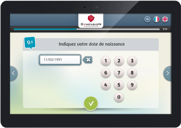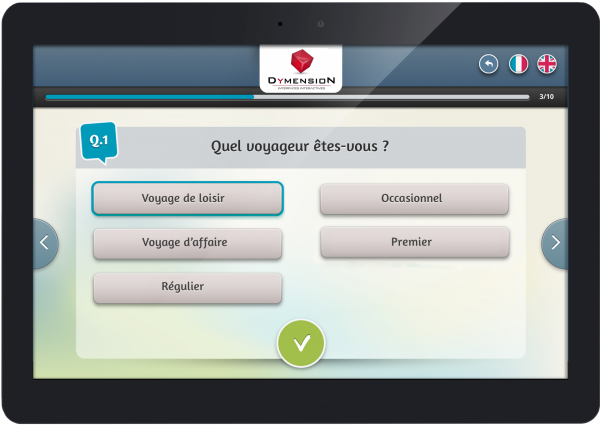 - Rapidité : Vos visiteurs ne passent que quelques secondes à répondre à un grand nombre de questions. Ils peuvent ainsi s’exprimer de façon ludique et rapide, loin des questionnaires papier et crayon. Vous obtenez des résultats et les alertes en temps réel.